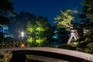 兼六園と金沢城の夜間ライトアップ。