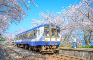 能登さくら駅の愛称で親しまれているのと鉄道の駅「能登鹿島駅」の桜が見頃を迎えました。観光列車「のと里山里海号」が入線する時間帯には、多数の鉄道ファンやお花見客で駅ホームが賑わいます。